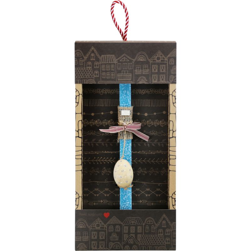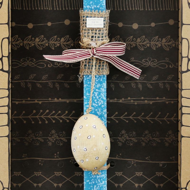 Πασχαλινή λαμπάδα διακοσμημένη με ένα υπέροχο ξύλινο αυγό σχεδιασμένο από την αγγλική εταιρία East of India. Τα υλικά διακόσμησης είναι υψηλής ποιότητας και εισάγονται αποκλειστικά από την SYNCHRONIA. Τα αντικείμενα σχεδιάζονται ή επιλέγονται για την αισθητική, την αυθεντικότητα, την φιλικότητα προς το περιβάλλον και το δίκαιο εμπόριο.