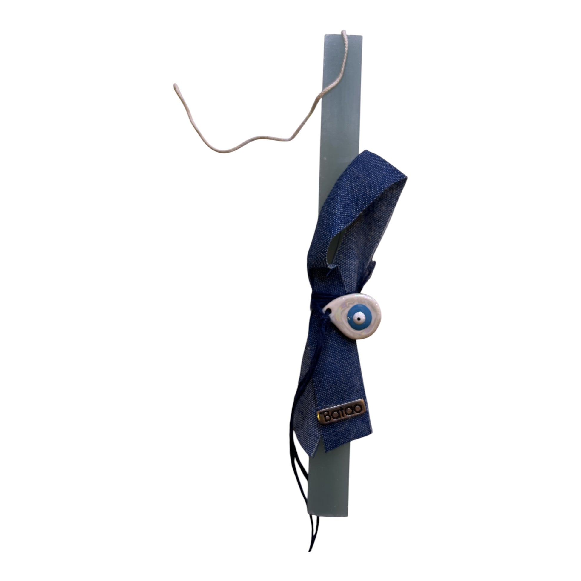 Η διακόσμηση της λαμπάδας είναι φτιαγμένη από ποιοτικό ύφασμα τζιν, προσθέτοντας μια μοντέρνα και ρουστίκ αίσθηση. Έχει ένα κεραμικό μάτι που προσφέρει προστασία και θετική ενέργεια, κάνοντάς την το απόλυτο σύμβολο ελπίδας και ανανέωσης.